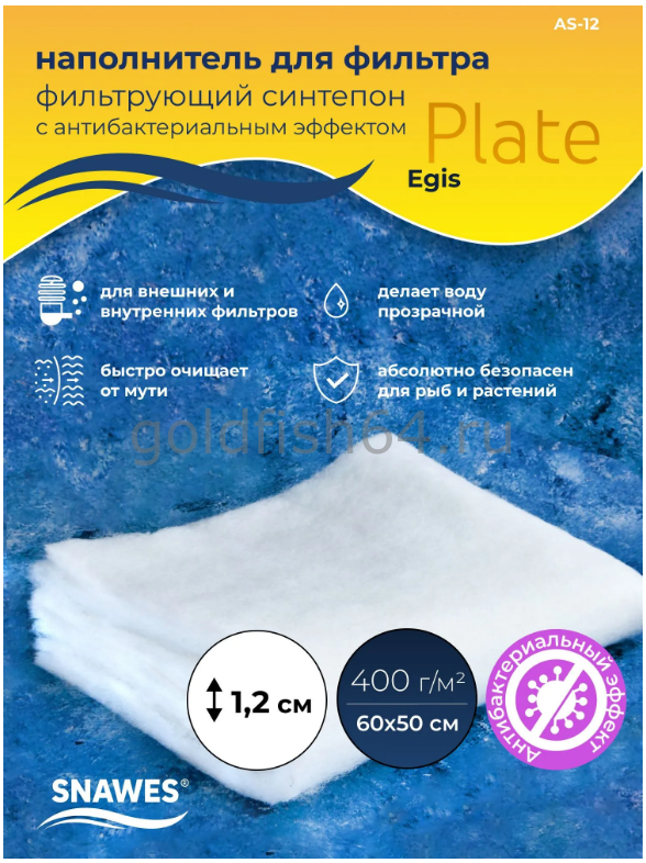 Синтепон фильтрующий SNAWES "Plate Egis" - это высококачественные синтетические волокна, созданные специально для водоочистки по особой технологии, которые могут находится в воде длительное время, не распадаясь и не разлагаясь. Синтетические волокна в фильтрующем синтепоне "SNAWES" имеют уникальную структуру, которая позволяет наиболее эффективно извлекать из воды частички загрязнений (ил, экскременты рыб и т.п.). Высокое качество синтетических волокон, позволяет держать форму более длительное время. За счет своей способности держать форму, синтепон не распадается на мелкие части, тем самым не загрязняя аквариум, и за счет формы, позволяет более эффективно очищать аквариумную воду механическим и биологическим способами. Синтепон фильтрующий SNAWES "Plate Egis" - обработан специальным антибактериальным составом, который эффективно борется с различными паразитами и грибками в аквариуме, при этом абсолютно безопасен для всех видов рыб и растений. Не является лекарством.