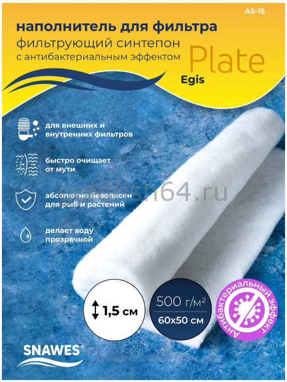 Синтепон фильтрующий SNAWES "Plate Egis" - это высококачественные синтетические волокна, созданные специально для водоочистки по особой технологии, которые могут находится в воде длительное время, не распадаясь и не разлагаясь. Синтетические волокна в фильтрующем синтепоне "SNAWES" имеют уникальную структуру, которая позволяет наиболее эффективно извлекать из воды частички загрязнений (ил, экскременты рыб и т.п.). Высокое качество синтетических волокон, позволяет держать форму более длительное время. За счет своей способности держать форму, синтепон не распадается на мелкие части, тем самым не загрязняя аквариум, и за счет формы, позволяет более эффективно очищать аквариумную воду механическим и биологическим способами. Синтепон фильтрующий SNAWES "Plate Egis" - обработан специальным антибактериальным составом, который эффективно борется с различными паразитами и грибками в аквариуме, при этом абсолютно безопасен для всех видов рыб и растений. Не является лекарством.