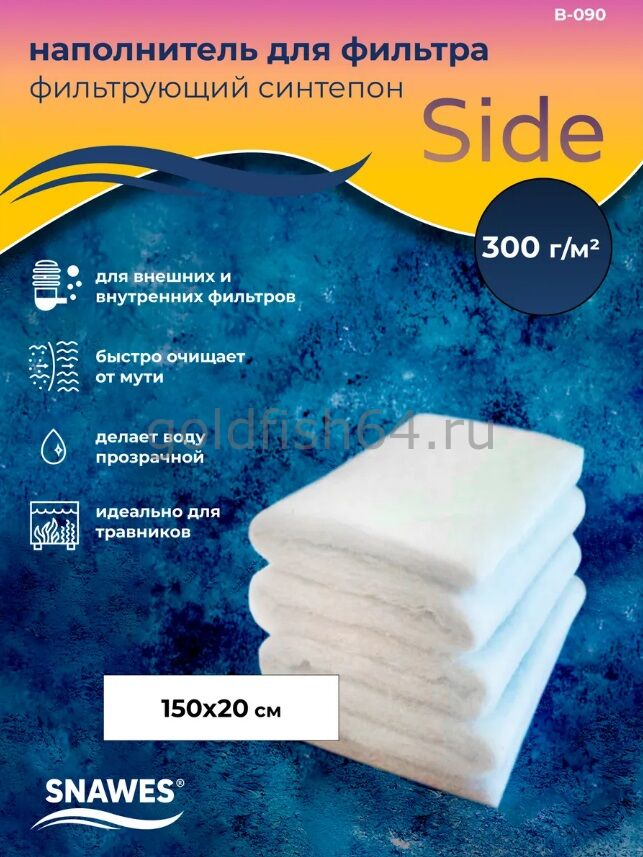 Синтепон фильтрующий SNAWES серии "Side" - это износостойкие синтетические волокна, созданные специально для водоочистки по специальной технологии. Материал фильтрующий нетканый используется в воде продолжительное время, при этом не распадается и не разлагается. Таким образом применяется механический и биологический способы очистки аквариумной воды. Вода становиться чистой.