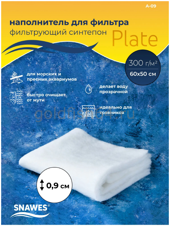Синтепон фильтрующий SNAWES "Plate" - это высококачественные синтетические волокна, созданные специально для водоочистки по особой технологии, которые могут находится в воде длительное время, не распадаясь и не разлагаясь. Синтетические волокна в фильтрующем синтепоне "SNAWES" имеют уникальную структуру, которая позволяет наиболее эффективно извлекать из воды частички загрязнений (ил, экскременты рыб и т.п.). Высокое качество синтетических волокон, позволяет держать форму более долгое время. За счет своей способности держать форму, синтепон не распадается на мелкие части, тем самым не загрязняя аквариум, и за счет формы, позволяет более эффективно очищать аквариумную воду механическим и биологическим способами.