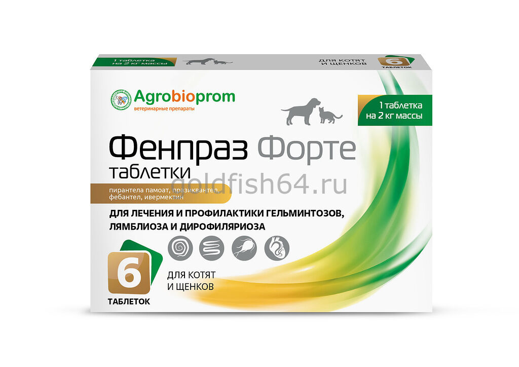 Фенпраз Форте таблетки для котят и щенков с содержанием в 1 таблетке, рассчитанной на 2 кг массы животного, действующих веществ: пирантела памоата - 28,8 мг, празиквантела - 10 мг, фебантела - 30 мг, ивермектина - 0,012 мг