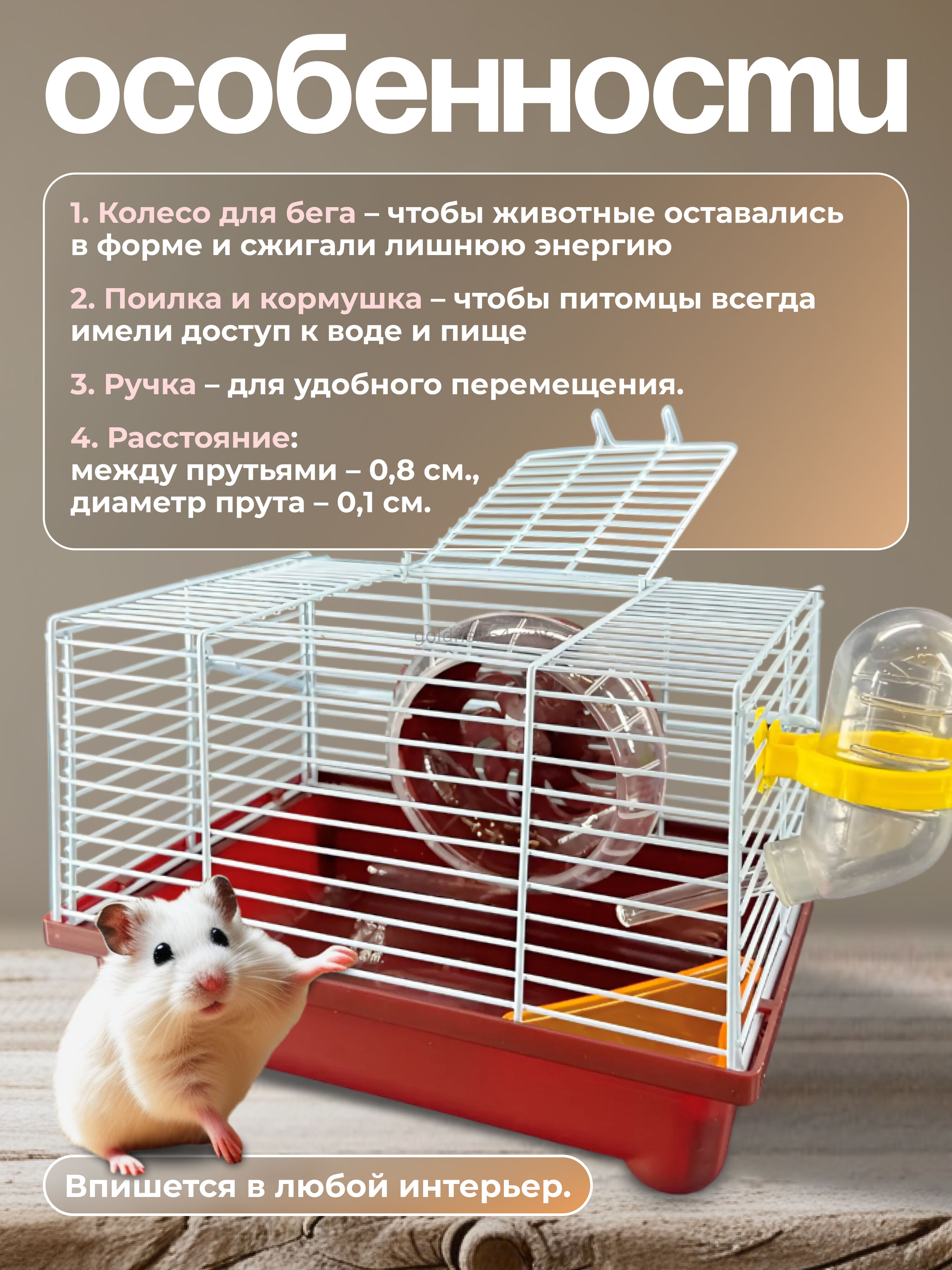 Размер: 22,5х17х16 см. Размер входа: 10,2х9,7 см. Глубина поддона: 4,5 см. Расстояние между прутьями: 0,8 см. Диаметр колеса: 10,5 см.