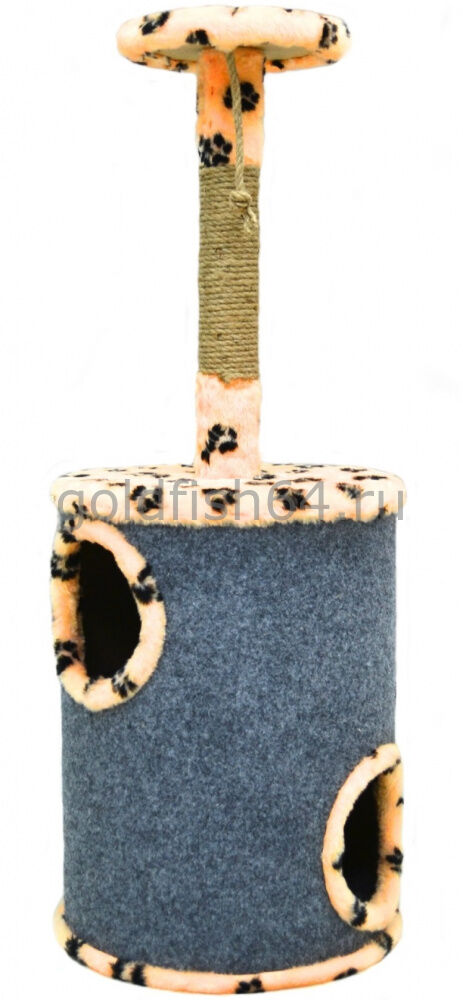 Компактный и уютный домик-бочка впишется в любой интерьер. Подходит как для одного, так и для нескольких животных Домик и полка круглые, изготовлены из ДСП и ДВП, обработанные мягким игрушечным мехом. Столбик-когтеточка изготовлен из плотного джута, который хорошо и мягко стачивает когти. На столбике имеется игрушка-кисточка для игр и приучения к когтеточке.