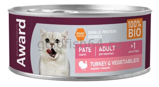 Влажный корм AWARD для взрослых кошек паштет из индейки с овощами 100г.