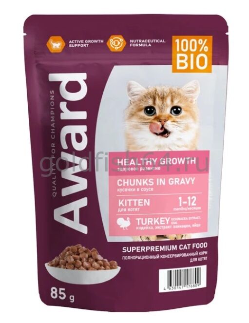 AWARD Полнорационный консервированный корм «Healthy growth» для котят от 1 месяца, кусочки в соусе с индейкой 85 г.