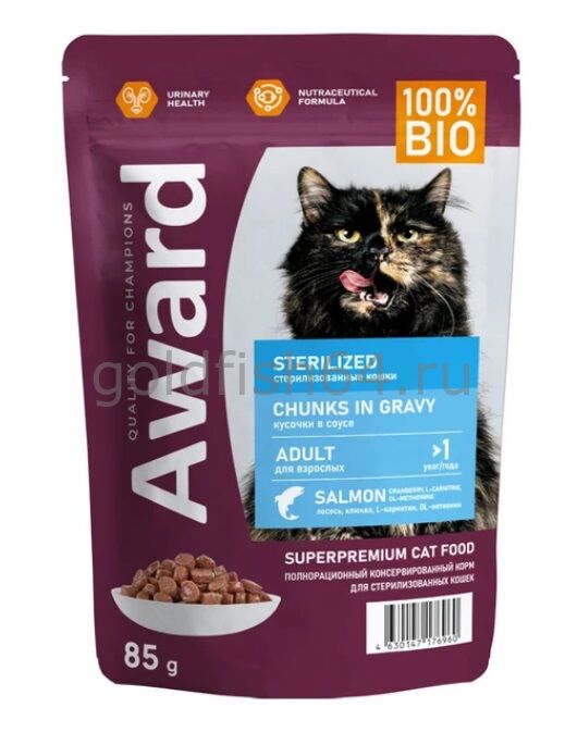 AWARD Sterilized влажный корм для кошек кусочки в соусе с лососем 85г