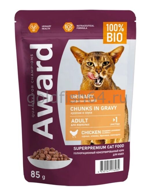 AWARD Полнорационный консервированный корм «Urinary» для профилактики мочекаменной болезни у взрослых кошек, кусочки в соусе с курицей 85 г.