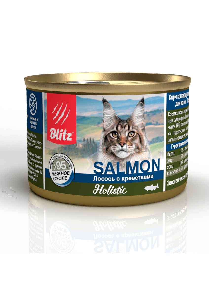 Уникальная рецептура, тщательный выбор компонентов и бережная обработка делают суфле Blitz Holistic «Лосось с креветками» отличным выбором для кошек, знающих себе цену!