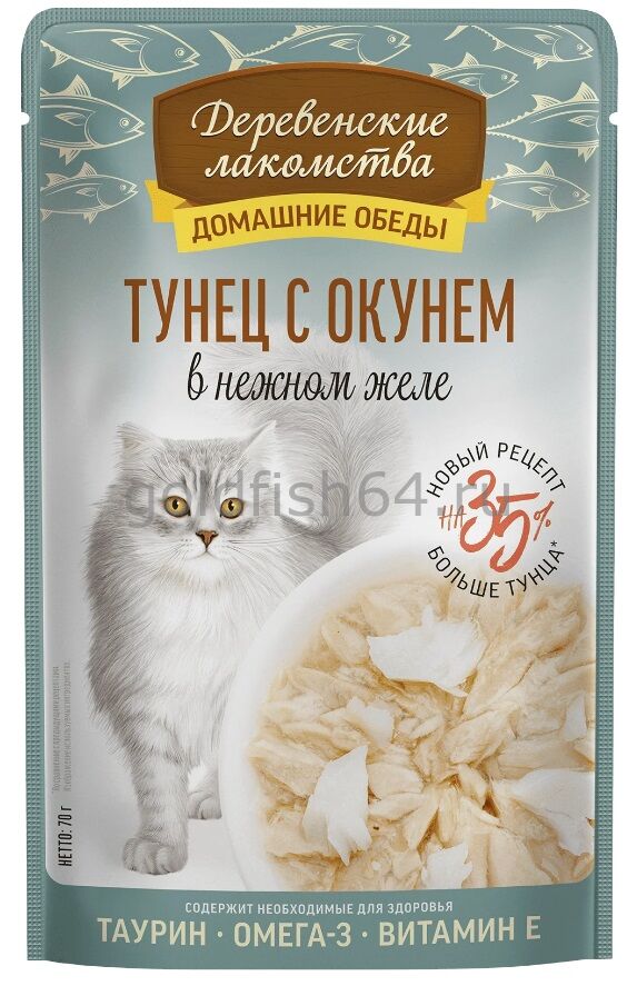 Деревенские лакомства для кошек Тунец с окунем в нежном желе 70гр