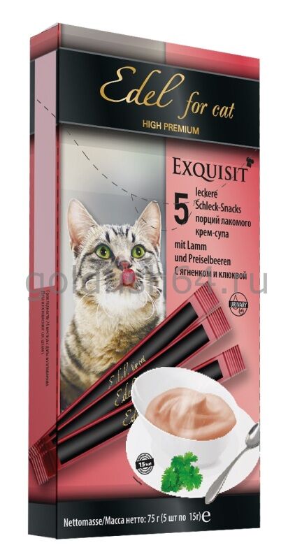 Лакомство для кошек Edel for cat крем-суп с ягненком и клюквой, 5шт по 15г. Крем-суп с ягненком, в каждой порции менее 15 ккал, содержание жира меньше 4%.