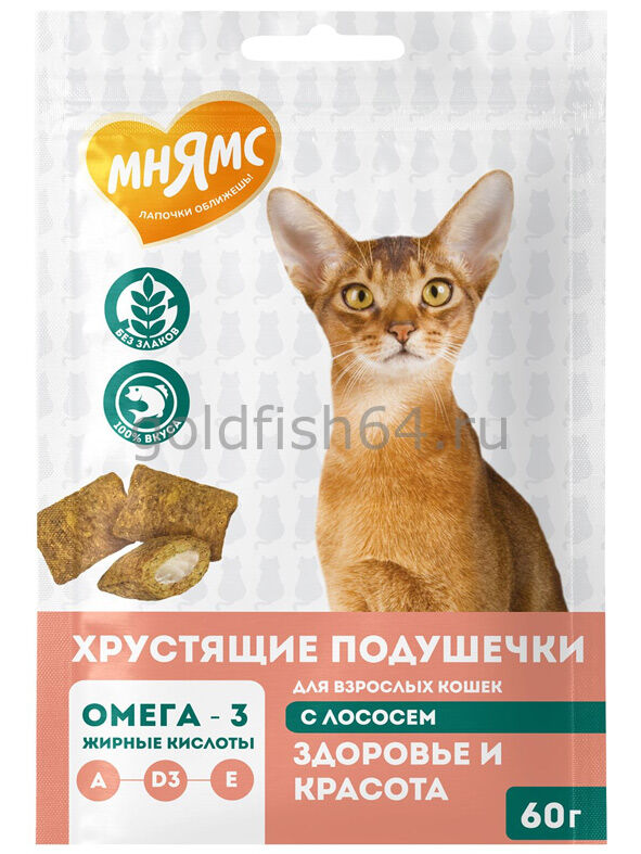 Мнямс Лакомство "Здоровье и красота" хрустящие подушечки для кошек с лососем 60 г.