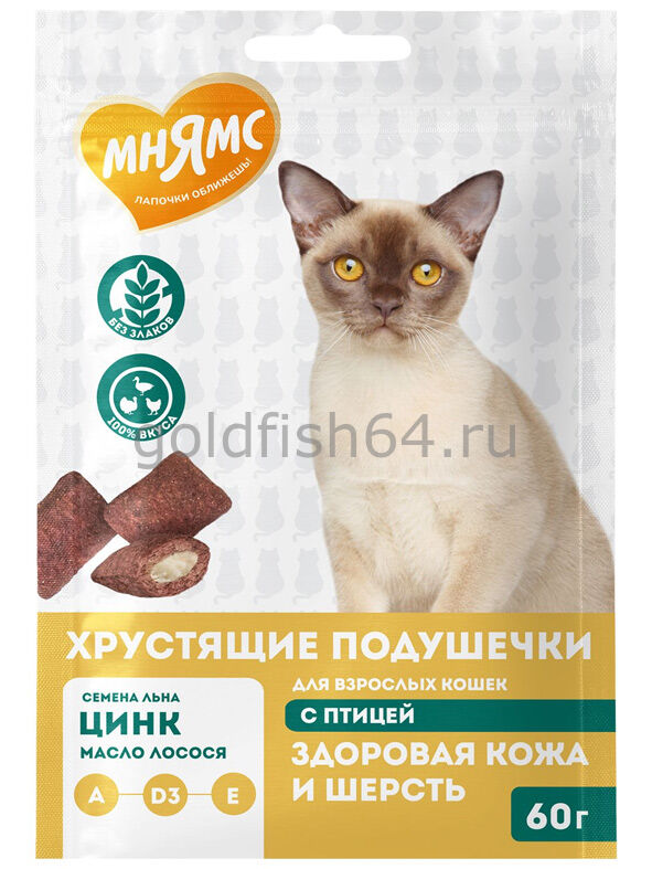 Мнямс Лакомство "Здоровая кожа и шерсть" хрустящие подушечки для кошек с птицей 60 г
