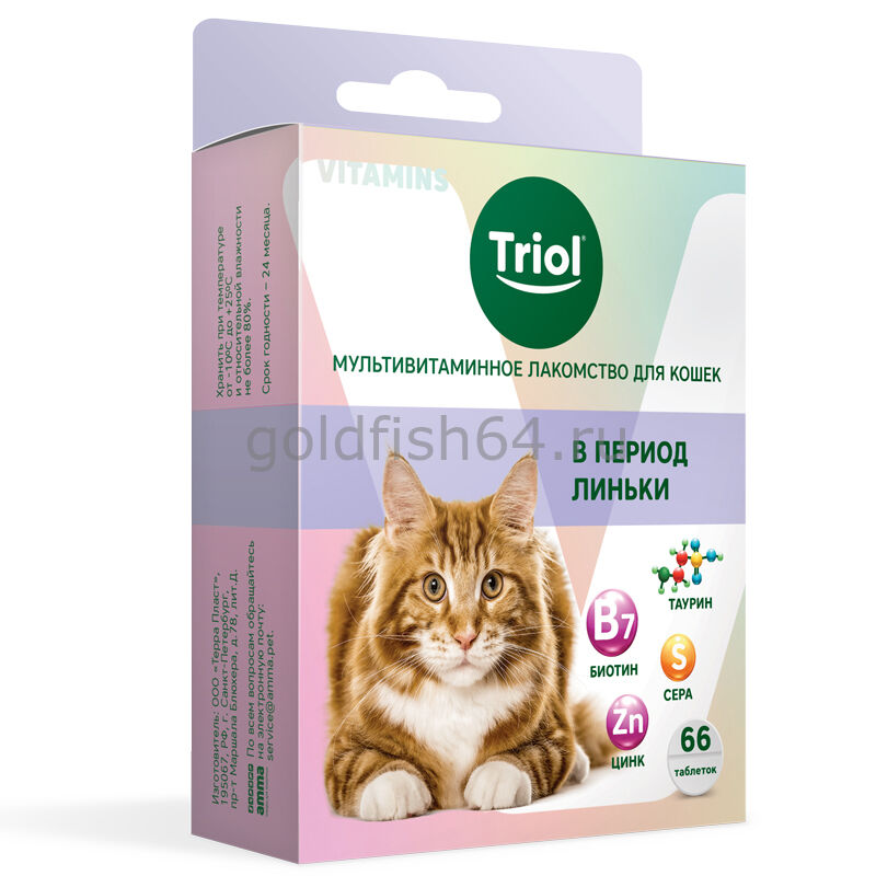Мультивитаминное лакомство для кошек «В период линьки» TRIOL - это источник полезных веществ, необходимых для поддержания естественной красоты и крепкого здоровья вашей кошки на долгие годы. Сера в составе лакомства является незаменимым микроэлементом в период линьки кошки, улучшает структуру шерсти, придает блеск, предупреждает ломкость, появление перхоти, обладает бактерицидным и противозудным свойством. Биотин и таурин ускоряют процесс линьки, предотвращая при этом выпадение здоровой шерсти. Цинк защищает кожный покров от дерматологических заболеваний и обладает антиоксидантными свойствами. Активные вещества помогают не только уменьшить количество выпадающей шерсти, но и оказывают общеукрепляющее действие, стимулируют иммунитет и способствуют повышению защитных свойств всего организма.