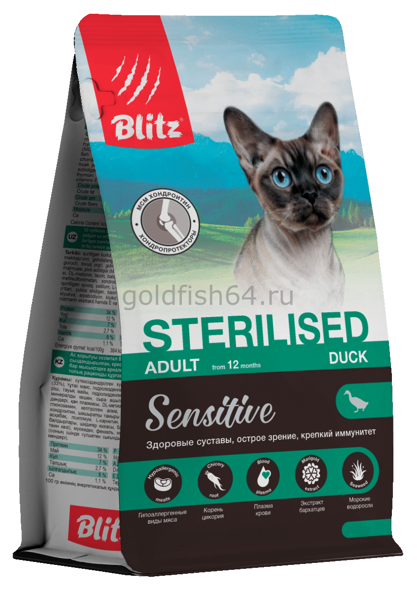 L-carnitine улучшает метаболизм малоподвижных котиков, DL-метионин и клюква служат профилактикой образования мочевых струвитов. Глюкозамин, хондроитин и метилсульфонил метан (органическая сера) снимают воспаления суставов и предотвращают артрозы у крупных и возрастных питомцев. Отдельного внимания заслуживают целебные растения, делающие сухой корм Blitz Sensitive Sterilised Duck с уткой ещё полезнее для кошек с чувствительным желудком.