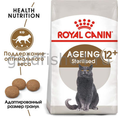 Корм сухой полнорационный сбалансированный для стерилизованных стареющих кошек в возрасте старше 12 лет AGEING STERILISED 12+ (ЭЙДЖИНГ СТЕРИЛАЙЗД 12+) ROYAL CANIN®, подходящий для стерилизованных кошек в возрасте старше 12 лет, специально разработан с учетом потребностей вашей кошки в питательных веществах.