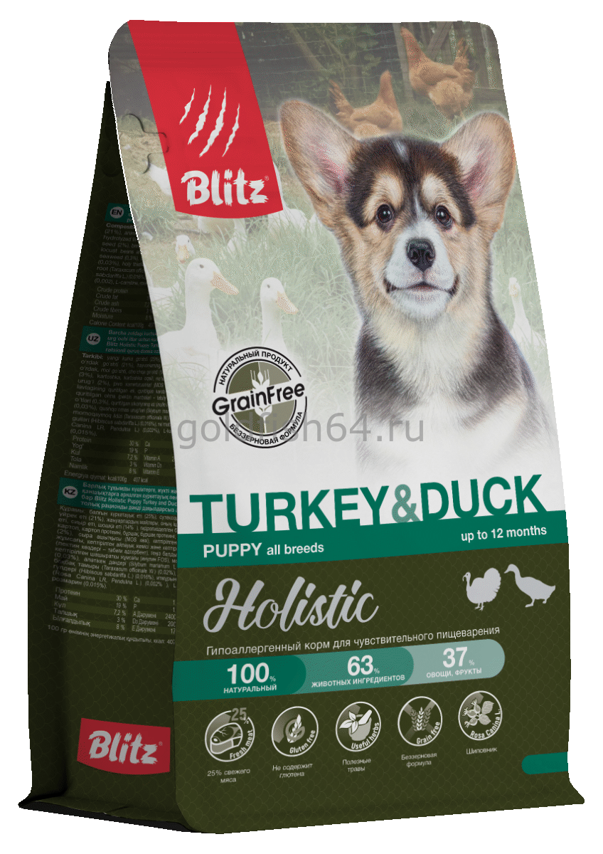 Рацион «Блиц» с индейкой и уткой подходит для кормления щенков, а также беременных и лактирующих сук. Он очень питательный, не содержит зерна и каких-либо искусственных добавок, красителей и консервантов — только много мяса и другие натуральные компоненты, которые позволят вашему любимому питомцу вырасти здоровой и сильной собакой, чтобы радовать вас долгие годы.