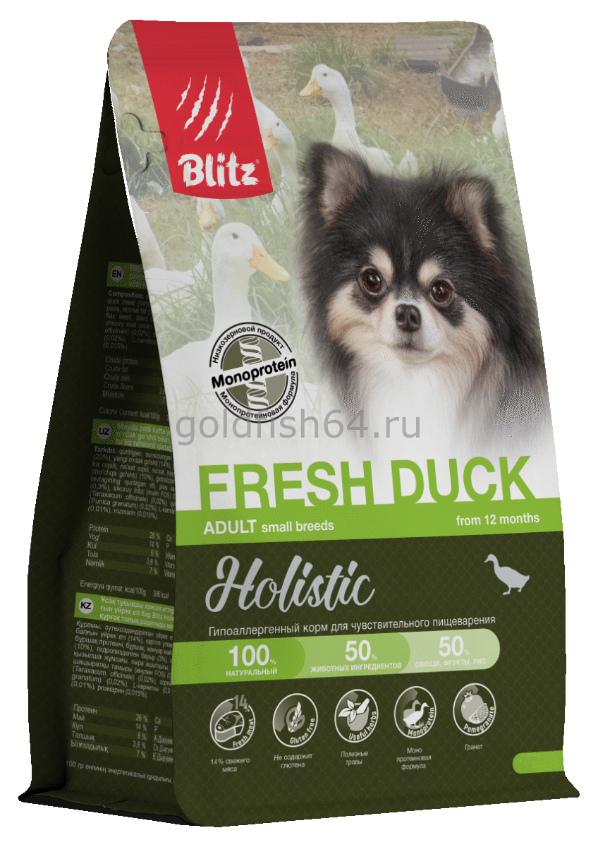 Даже маленькая собака — в душе настоящий охотник! Порадуйте её самой желанной для каждого пса добычей — свежей утятиной! Корм Blitz Fresh Duck Small Breeds не только обладает отличным вкусом, но и приносит большую пользу организму. Свежее и дегидрированное мясо утки — настоящий кладезь ценных нутриентов, в нём очень много витамина А и железа, а также полный набор незаменимых аминокислот. Кроме того, утка гораздо реже вызывает аллергические реакции, чем другие виды мяса, и здесь это единственный источник животного белка. Можно смело выбирать монопротеиновый корм Blitz Holistic с уткой для мелких собак, склонных к проблемам с пищеварением и аллергиям. Даже если охотиться ваша собака лишь во сне, совсем небольшое количество высокоусвояемого риса и сниженное содержание жира в корме не позволят ей набрать лишний вес, а ряд полезных дополнительных компонентов добавит ей здоровья: