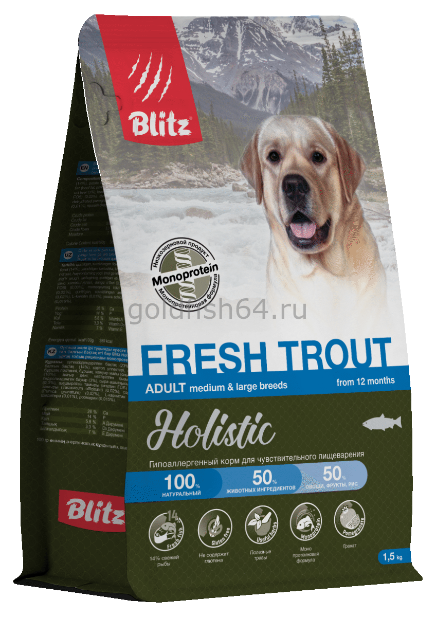 Блитц Низкозероновой корм для собак средних и крупных пород Форель 1,5 кг
